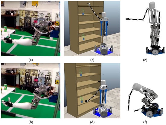 For elderly care specifically, the arm and hand allow the robot to perform essential tasks. Picking up objects from the floor, low tables, counters and shelves and transporting them to the desired place ease many tasks that otherwise would either not be done or be done with many risks associated. With the addition of the anthropomorphic hand, the robot can easily interact with everyday objects specifically designed for the human hand with different types of grips and grasps. In Figure 4 solutions with both two arms and one arm are presented. The real-world robot and real-world tasks only uses one arm, as can be seen in Figure 5c, whereas the simulated robot already uses the two arms.