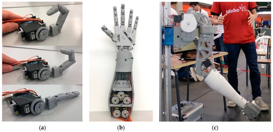 This arm can be divided into three main parts: (i) hand and forearm; (ii) bicep; and (iii) shoulder. Most generic service robots with robotic manipulators tend to use grippers to simplify this task. However, the anthropomorphic hand presents more DOFs that allow the robot to best use the hand according to the object, providing greater dexterity capability [,]. The hand is composed of five fingers, similar to a human hand, to provide different ways to pick up various objects. Each finger has a different number of joints, as can be seen in Figure 5a. The thumb has two DOF, the index and middle finger have three DOF, and the ring and little finger have four DOF. Each finger has one actuator (servo motor) that moves all DOF of the respective finger. The movement is based on a pulley mechanism, similar to tendons, where the motors are located in the robot’s forearm, as shown in Figure 5b with fishing line tendons leading to the fingers. So, regarding kinematic architecture, this is an underactuated hand since, in total, it has seventeen DOF, but only five actuators. The wrist has one servo motor responsible for rotating the hand. The bicep has two servo motors, one responsible for lifting and lowering the forearm, and the second responsible for rotating the bicep and the forearm. The shoulder has two individual DOF for moving the whole arm parallel to the robot body and lifting the whole arm perpendicular to the body. In total, as shown in Figure 5c this redundant manipulator has 22 DOF with 10 actuators, which define the movement of the arm. The Denavit-Hartenberg parameters for the arm are described in the Table 1.