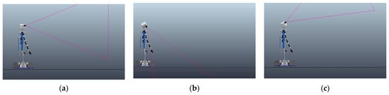 CHARMIE’s field of view using the neck DOF. (a) Parallel to the motion platform (0°). (b) Looking down to see objects near the motion platform or on the ground (−60°). (c) Looking up to see items on top shelves (+30°).