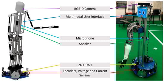 The robot’s sensory system setup [] is presented in Figure 7, where each sensor location is described on both implementations of CHARMIE’s body. In the head, at a maximum height when the lifting mechanism is at the top position, the RGB-D camera is at 1.50 m which can rotate, tilting the head up and down. The initial RGD-D camera used is the Microsoft Kinect for all the tasks. However, with the recent acquisition of the Intel® RealSense™ Depth Camera D455 camera for CHARMIE, some human pose estimation tasks have already been developed using the new camera. The microphone, the speaker and the multimodal user interface lay on the torso with a maximum height of 1.30 m. The laser range finder is on top of the motion platform at approximately 25 cm of height. All the sensors related to the motors (voltage, current and encoders) are attached to the motors.