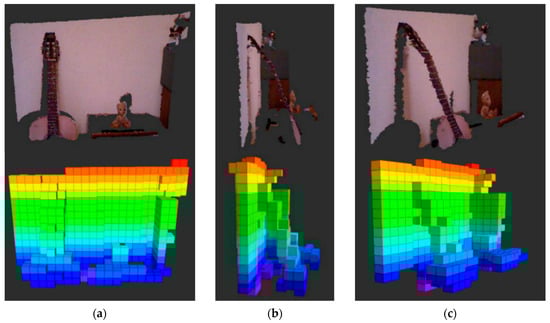 Three different perspectives (a–c) of the same two objects, a toy on a desk and a leaning guitar on a wall converted into an OctoMap to simplify mapping high detail objects.