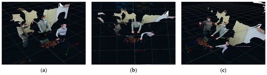 Three different perspectives (a–c) of three human users interacting with CHARMIE. The robot fuses the RGB and Depth cameras’ information to create a 3D view of the environment.