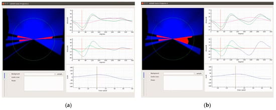 Two different variations (a,b) of the dynamic field vector system are displayed depending on the various obstacles that the robot faces. The blue and red 2D graph on the right of both images represents the 2D LiDAR data. The bottom graph represents the velocity graph with one attractor to the desired speed. The middle graph represents the influence of the various obstacles the robot faces and consequential repulsors. The top graph represents the angle attractor (pink), the sum of all repulsors (green) and the final dynamic field vector system (black).