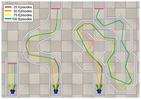 Trajectory evolution throughout the learning process of a differential robot autonomously solving a maze using Q-Learning. Image from [].