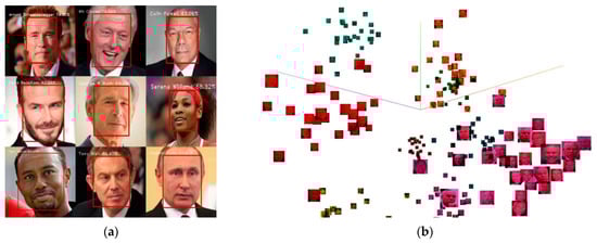 (a) The MTCNN algorithm’s output using “Labeled Faces in the Wild dataset” [] of nine different personalities. (b) The PCA graph from Tensorboard from the MTCNN test dataset.