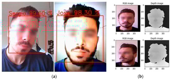 When updating to 3D user recognition technology, some works that use the same camera (Microsoft Kinect) [] show algorithms that can overcome different face poses, expressions, illumination and disguises. Other solutions, such as FaceNet [], demonstrate a deep convolutional network trained to directly optimise the embedding itself. The depth solution CHARMIE employs to recognise a small number of users uses various deep convolutional neural networks, similar to the one with just the RGB that integrates both the RGB and the depth image. Figure 14a demonstrates a classification example of two users using the depth information in addition to the RGB. The lack of different trained users can justify the significantly higher values of certainty compared to the 2D solution. However, some problems, such lightning and the pictures of users, can be successfully filtered with the depth camera’s addition. An example of the lightning condition being filtered is shown in Figure 14a right image. Figure 14b shows the two images input to the neural networks, the RGB and the depth matrix.
