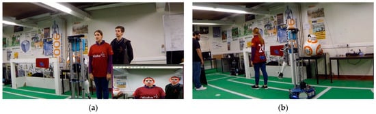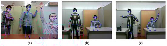 The cameras distinguish a human from the background and identify the position of several features or joints, such as the head, knees, elbows and hands. Once identified, the software connects the joints into a humanoid skeleton and tracks their position in real-time, providing the X, Y and Z coordinates for each of the skeleton points. The addition of depth cameras [] allows the skeleton tracking system to remove uncertainties between overlapping or occluded objects or limbs, making the method more robust to different lighting conditions than a 2D camera-based algorithm []. The algorithm used is based on the Skeleton Tracking SDK by cubemos. It provides fast and highly accurate 2D and 3D human pose estimation that allows tracking of 18 joints simultaneously (two ankles, two knees, two hips, two wrists, two elbows, two shoulders, one between the chest and the neck, one nose, two eyes and two ears). Due to the artificial intelligence algorithms, it can track up to five people in real-time. Figure 15 shows the skeleton-fitting pose estimation overlaid on the users. It can detect high-speed movements and estimate a joint location, even when hidden from the camera. Figure 15c shows that the robot with pose only estimation can detect when a person raises their arm in the air to ask for assistance.