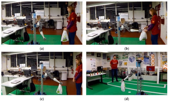 The joints tracked by the algorithm also allow the agents to communicate or transmit information using different gestures. Some technologies like optical flow provide solutions to track movement between images. This demonstrates the movement from people or animals, as long as it is in a different direction from the camera’s movement and allows 2D verification of the movement direction. FlowNet2 [] presents an end-to-end solution based on convolutional neural networks to estimate optical flow. It uses various methods that allow estimating movements at both quick and slow speeds. All of the methods have different purposes, and their combination, despite providing good results, is very computationally expensive. So, LiteFlowNet [] introduces a different end-to-end convolutional neural network architecture to estimate optical flow. This network, used by CHARMIE for gesture recognition, uses an optimised neural network structure whose goal is to have results with the precision of FlowNet, but with a lower computational expense. In Figure 16, the human agent performs a gesture, from (a) to the (c), where it shows the palm of the hand to the robot, then closes the fist and brings it to its chest. The robot can detect different sets of movements that can be configured and associated with a specific task the user intends the robot to do.