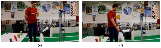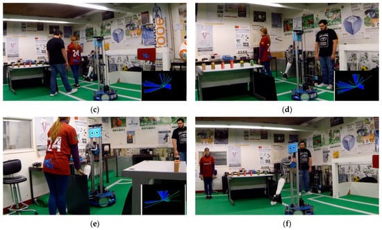 In Figure 21, extracted from the video in Appendix A, all of the steps regarding the “Follow Me” task can be seen. The user starts by asking the robot to follow him/her to navigate to the compartment where help is needed, as can be seen in Figure 21a. The robot uses both the 2D LiDAR and the RGB-D camera to lock the user it is following, as can be seen in Figure 21b. During the process, the robot can navigate narrow spaces and even avoid collisions with humans that pass between the followed user and CHARMIE, as can be seen in Figure 21c,d. Almost at the end of the route, a new obstacle comes up, the robot detects that the followed user has an insuperable barrier similar to a wall (represented by the black cardboard demonstrated in the video in Appendix A that the robot cannot surpass, as can be seen in Figure 21e. Thus the robot, using the environment’s map, calculates an alternative route to get back to its user, as can be seen in Figure 21f. In the return path, CHARMIE finds novel obstacles that it can successfully overcome.