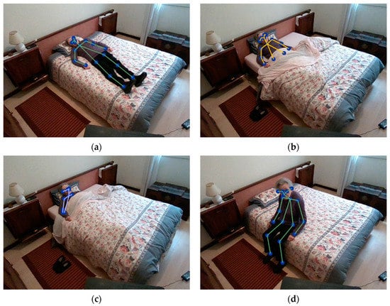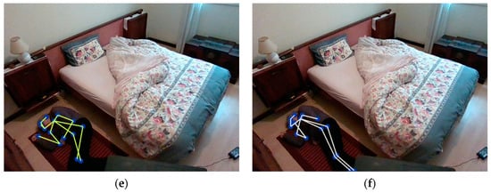 The first possible scenario is the detection of a patient laying in bed. However, this scenario may present some different variations. The first, displayed in Figure 20a, shows the pose detection of a patient laying on the bed without any covers. The second, shown in Figure 20b, demonstrates a patient laying in bed but covered from the waist down. The third, Figure 20c, shows a patient laying in bed but covered from the neck down with an arm also showing. In the first two cases, the pose estimation algorithm can detect properly that the user is safely laying in bed, but the third example does not always detect successfully. Thus, when the robot cannot estimate the pose, it analyses the bed height variation to differentiate between the patient laying in bed and the bed being empty. If the patient is not laying in bed and no pose estimation is made inside that room, two different situations may occur, the patient is either missing or sleeping deep inside the covers. If the patient is laying on the bed, the robot calmly leaves the room and slightly closes the door. By analysing the bed height variation, should it detect there is no patient in the room, it sends an emergency warning to the healthcare workers that a patient might be missing. Another scenario results when a patient is sitting on the bed, Figure 20d, and requires non-emergency help. In this case, CHARMIE also summons a healthcare professional but in a different way to the first case. The last scenario displays the worst case: an elderly person has fallen out of bed and cannot get up, as can be seen in Figure 20e,f. If CHARMIE detects this scenario, it immediately sends an emergency message to all of the healthcare professionals. This recognition process is repeated throughout all of the rooms in the nursing home. For an older person who lives by themselves, this recognition system can be temporarily programmed.