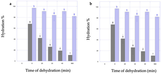 Graphs showing VitE 1 (a) or VitE 0.1 (b) scaffold rehydration capability. Blue bars indicate hydration status after 1 h of soaking in UP water. Time refers to dehydration in oven. Gray bars = starting dehydration level; blue bars re-hydration level.