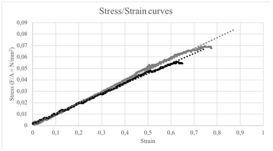 The slope of the elastic portion (linear) of each curve was calculated, corresponding to the elastic modulus (Young’s modulus), derived from the formula: