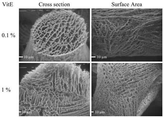The SEM analysis highlighted the presence of a porous network both on the surface area and in the cross section. In particular, the analysis of these images according to the method described (Section 2.5.2) showed that the surface area of the VitE 0.1 scaffolds was characterized by the pores having sizes between 4 and 14 µm, while for the VitE 1 scaffolds, the pore size was within 3 and 57 µm. In the cross section, the VitE 0.1 scaffolds showed pores in the range between 5 and 40 µm, while the VitE 1 scaffolds, similar to the characteristics of the pores observed on the surface, displayed a bigger pore size range, which was between 10 and 57 µm (Figure 3).