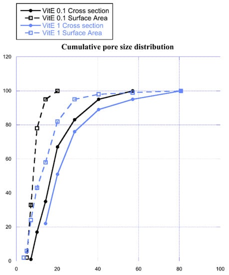 During scaffold preparation for SEM analysis, a visible volumetric reduction was noticed after the freeze-drying process. It was calculated that the scaffold volume, once anhydrous, was reduced to 41.7 ± 3.2 %; it is reasonable to assume that the pores in the network were subject to an analogue reduction. The estimated real size ranges concerning surface area were 6–20 µm and 4–81 µm for VitE 0.1 and VitE 1, respectively, while the recalculated cross section ranges were between 7 and 57 µm and 14 and 81 µm for VitE 0.1 and VitE 1, respectively. Cumulative pore size distribution is shown in Figure 4.