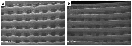 The three-dimensional model was constructed by overlapping two figures presenting parallel strands and rotating them by 90°. In total, five layers were superimposed, forming an orthogonal grid with fixed distances between filaments of 200 μm and creating a three-dimensional “gauze”. The total sizes of the objects corresponded to 15, 15, and 1.3 mm for the width, length, and thickness, respectively (named as regular scaffolds). The cross section diameter taken from the strands was considered to be 260 µm for the design.