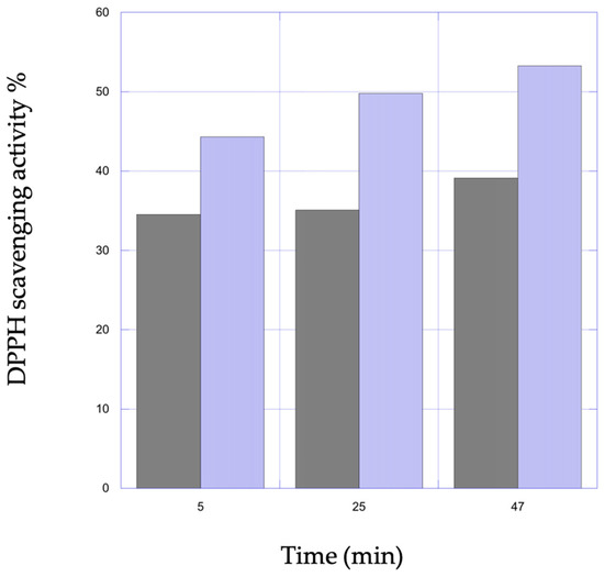 In this work, the scavenging activity of VitE tested through DPPH assay demonstrated the active antioxidant capacity of the compound included in chitosan hydrogels. The scavenging activity of the VitE 0.1 samples were discrete, ranging from 35.5% after 5 min to a maximum of 39.1% at 47 min and did not show appreciable changes over time (Figure 6).