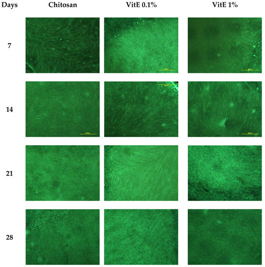 The biocompatibility of the VitE/chitosan scaffolds was tested on human fibroblast cultures (Figure 7). Cells grown up to 28 days maintained the typical spindle morphology and remained close to confluence independently from the presence of VitE and from its concentration. By specifically observing images taken at day 7, it is possible to state that cells on the VitE 1 scaffolds proliferated with a certain delay with respect to the VitE 0.1 scaffolds and the control. At day 14, fluorescent clusters of cells started to be visible in all of the samples within the macro-pores. After day 21, confluence was achieved in all of the scaffold types, and the cell density was higher than previous sampling points, demonstrating high biocompatibility and excluding the hypothesis of toxic effects.