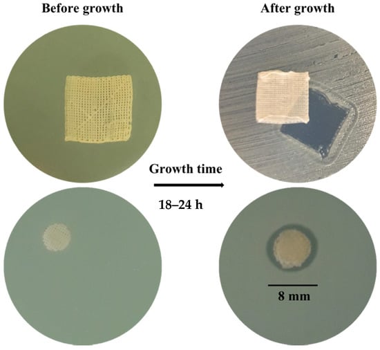VitE0.1 and VitE1 scaffolds were cut with circular 6 mm diameter stamps (same size as antibiogram discs). Samples were disinfected as reported in Section 2.3.3 and were subsequently stored in sterile water at 4 °C prior to the start of the experiment.