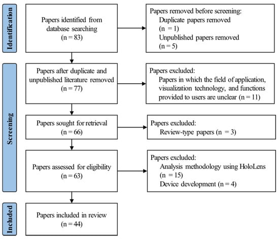 Next, selection criteria were determined to narrow the papers for further review. Papers that are duplicated, unpublished, or linguistically difficult were excluded (six studies). Filtering was performed using additional selection criteria in the following order: (1) papers in which the field of application of HoloLens, visualization technology, or functions provided to users were unclear were excluded; (2) the second filter excluded literature reviews; (3) the third filter excluded papers containing methodology using HoloLens or similar device development, rather than the use of HoloLens in a field. As a result, 44 papers were selected from the results of the four filters for further processing (Figure 1).