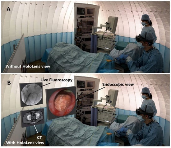 Al Janabi et al. [] evaluated whether the HoloLens HMD could potentially replace the conventional monitor that is used in endoscopic surgery. The evaluation was conducted with 72 participants, i.e., with novices (n = 28), intermediates (n = 24) and experts (n = 20). The participants performed ureteroscopy in an inflatable operating environment using a validated training model and the HoloLens MR device as a monitor (Figure 2). Consequently, even the novice group was able to complete the assigned task successfully. However, the experienced group found it difficult to complete the assigned task because the new device was unfamiliar to these participants. However, 97% of the participants agreed that HoloLens would play a useful role in surgical education and 95% of the participants strongly agreed that it could be introduced clinically.