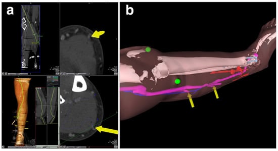 Original CTA imaging, segmentation and corresponding polygonal models. (a) CTA imaging indicating the location of the perforating arteries with yellow arrows. (b) Example of a HoloLens rendering of the segmented polygonal models [].