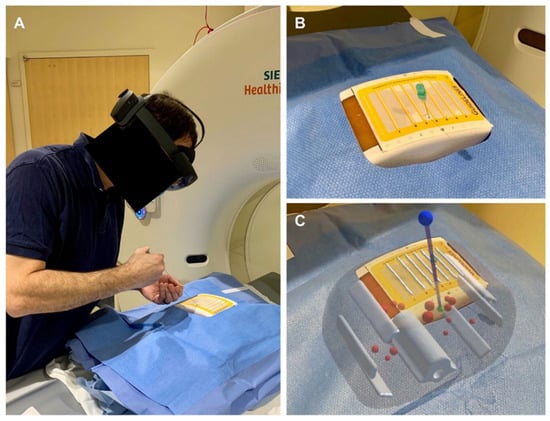AR-assisted navigation using HoloLens 2. (A) Participant inserts the needle while wearing HoloLens 2. (B) View of the needle insertion without AR, (C) View of needle insertion through HoloLens 2 with a 3D model and virtual needle guide projected onto the phantom [].