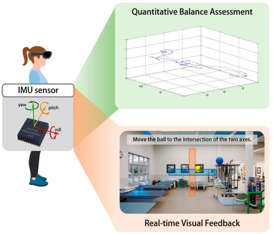 Lee et al. [] proposed a balance rehabilitation method based on AR. This method measures the movement of the head through an inertial measurement unit sensor mounted on an AR HMD and quantitatively assesses the individual’s postural stability. Moreover, it provides visual feedback to the user through holographic objects that interact with the head position in real time (Figure 5). The proposed method was validated using eight participants, who performed three postural tasks three times, depending on the presence or absence of AR. The center of pressure (COP) displacement was measured using the Wii Balance Board and the displacement of the head was measured through the HoloLens. Consequently, significant correlations were observed between the COP and head displacement. Additionally, there were significant differences between patients with and without AR feedback. However, the experiments performed were not statistically significant because the sample size was small.
