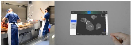 Bulliard et al. [] performed a virtual autopsy using AR technology (Figure 6) and investigated the possibility of using an AR HMD to enhance autopsy in real-world conditions. They used Microsoft HoloLens as the AR device and five participants performed a virtual autopsy. The participants were able to identify major pathologies in all cases on AR Virtopsy, which took an average of 122 s per case. Further, in AR autopsy, most of the interactions occurred during the first 30 min of the internal examination of the autopsy; it was confirmed that the frequency of interactions decreased and shortened as time passed. AR headsets can help implement image data, such as post-mortem CT, in the autopsy hall and have been shown to be most beneficial during the first 30 min of an internal examination during autopsy.