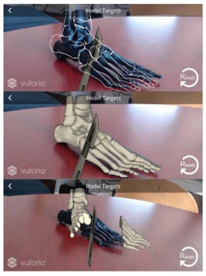 Caligiana et al. [] developed an MR application that is useful for modifying and cutting virtual objects and proposed digital simulations of the surgical operations. Figure 7 shows a perfect match between the real and virtual objects reached using the AR platform, Vuforia. With this tool, it is possible to automatically adjust the virtual model to the correct dimensions and convert the actual 3D printed bones to markers themselves. This approach can achieve high precision in surgical applications. Additionally, because the proposed approach is based on HoloLens, the leap motion device and Unity, it is hands-free and does not require the use of a mouse or computer keyboard. Case studies have confirmed that surgeons can simulate real-world surgery by tracking and rapidly cutting the virtual objects. The cutting time is reduced in this simulation compared to conventional methods; furthermore, the high flexibility of the tool and excellent fidelity of the geometry were confirmed.