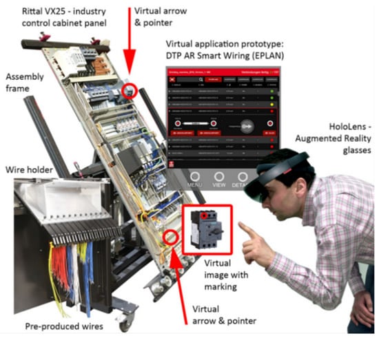 Szajna et al. [] applied AR technology to the wire assembly and production process; in particular, they produced and tested a system prototype for an assistance device for the wiring of control cabinets. The system identifies the elements of the environment online and provides significant support to a particular operator in the control cabinet assembly and production line. The operation process of the system proceeds as follows. (1) A CAD file is loaded into an EPLAN smart wiring (ESW) system (wiring support system). (2) When the user selects a wire displayed in the list of ESW systems via virtual screens or physical touch screens, extended information and data, such as wire length, connection point details and 3D graphics, are displayed. (3) The user collects a wire of an appropriate length from a wire holder. (4) The AR glasses-related software uses certain coordinates provided by ESW’s 3D graphics along with particular markers on a cabinet and matching algorithm to indicate the wire’s assembly point through virtual arrows, pointers, virtual images with markings, or textual prompts. (5) The user displays the assembly of a particular wire on a virtual touch screen with a simple gesture or voice command. (6) The user collects the next wire and repeats the operation within the process. Figure 8 shows an overview of the production station and general system principle. Szajna et al. conducted tests to determine whether the system supported the control cabinet production process. Consequently, it was verified that the wire assembly process can be significantly shortened using an AR glass-based system.