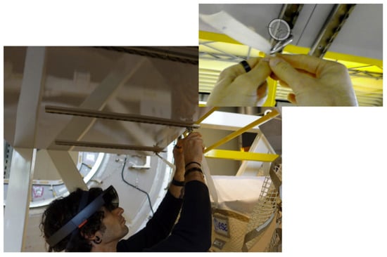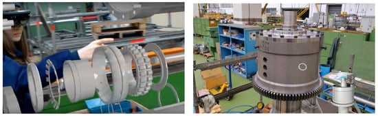 Vidal-Balea et al. [] developed a new collaboration application based on HoloLens that allows shipyard operators to interact with a virtual clutch, while assembling a turbine in a real workshop. The application acts as a virtual guide, while assembling different parts of a ship. The users can receive information on documents for each part of the clutch using the AR device and check the relevant blueprints and physical measurements. The developed solution was tested, while performing the assembly process of a clutch comprising numerous mobile parts of various shapes and sizes. Figure 9 shows a screenshot of the developed application, where the sequence of steps for the correct assembly of the clutch is visualized via animation, along with blueprints and documents associated with the component. It was possible to visualize the virtual elements in detail according to their real size; further, even before the production of such elements started, it was confirmed that the actual elements were accurately placed in a precise manner, in a position where they would be integrated.