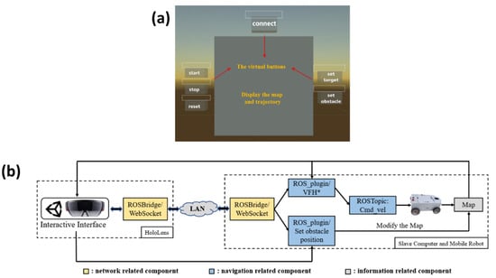 Wu et al. [] proposed a novel control system for the path planning of omnidirectional mobile robots based on MR. The proposed system can control the movement of a mobile robot in a real environment and the interaction between the movement of the mobile robot and virtual objects that can be added to the real environment. An interactive interface is provided through HoloLens, which displays maps, paths, control commands and other information related to the mobile robot. Furthermore, by adding a virtual object to a real map, real-time interaction between the mobile robot and virtual object can be realized. The interface of the proposed system has a virtual panel and some buttons created with the Unity3D software combined with HoloToolKit, as shown in Figure 10a, and the communication mode of the system shows the flow, as shown in Figure 10b. According to the verification performed in an indoor environment using the proposed system, it was found that the proposed method can generate the movement path of the mobile robot according to the specific requirements of the operator, while demonstrating excellent obstacle avoidance performance.