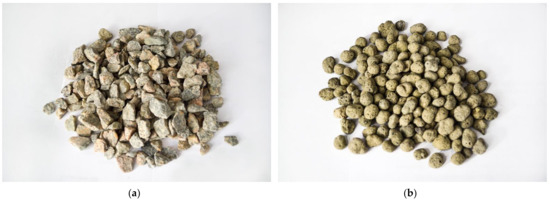 Crushed granite (a) used as a large aggregate and slag pumice (b) used as a combined aggregate.