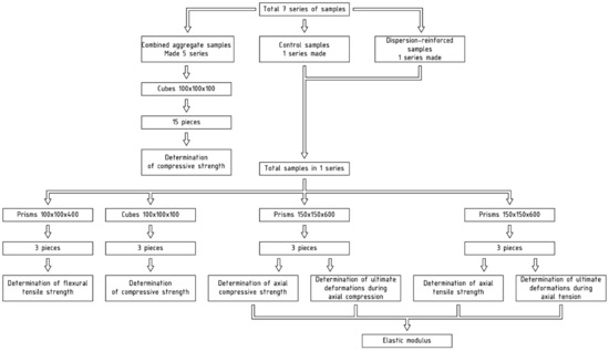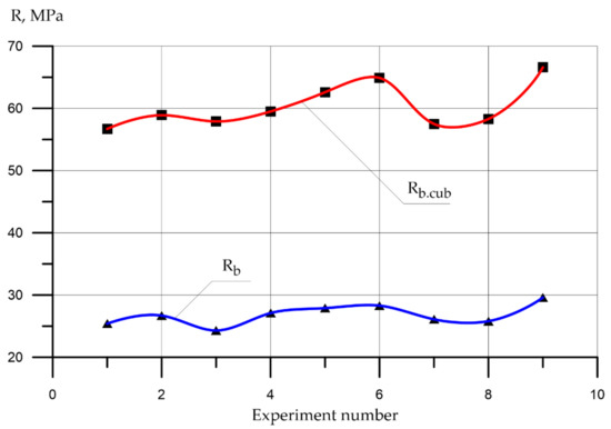 Compression and tensile bending tests were conducted in accordance with the requirements of GOST 10180 “Concretes. Methods for strength determination using reference specimens” [30].