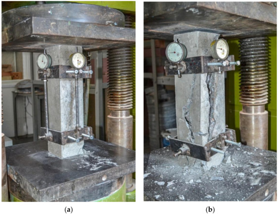 Photo of determining the deformation of the prism sample under axial compression (a); destroyed sample (b).