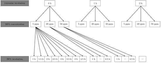 Flowchart of the different groups of L-tyrosine incubation times, used BPA concentrations and BPA incubation times; ppm = parts per million.