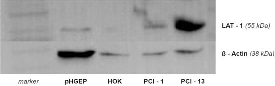 Results of Western blot for proteins from PCI 1 and PCI 13. LAT-1 is detectable for both cell lines at 38 kDa. Human oral keratinocytes (HOK) and pooled human gingival epithelial cells (pHGEP) were used as control. The expression is clearly higher in PCI 1 and PCI 13 when compared to controls.