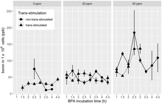 Line charts with error bars for standard error (SE) indicating boron content independent of BPA concentration (5, 20 and 50 ppm) and BPA incubation time (ppb = parts per billion, circles indicate non-trans-stimulated and triangles trans-stimulated cells).