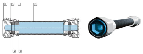 Pneumatic artificial muscle of MAS–20 type (1) connecting matrices (wrought aluminium alloy); (2) flange (wrought aluminium alloy); (3) internal cone (wrought aluminium alloy); (4) disc springs (steel); (5) sealing ring (nitrile rubber); (6) tube (chloroprene and aramid) [33].