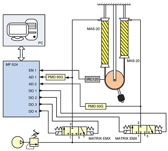 The basic component of the control unit was a PC with an Intel Core 2 Quad processor with a clock frequency of 2.33 GHz and a 4 GB operating memory. The main component for interconnecting the real system with the computer was the input–output measuring card of the MF 624 type by Humusoft. It contains a 14-bit A/D converter with a simple shaper, 4 software-adjustable ranges, and an 8-channel multiplexer at the inlet, 8 independent 14-bit D/A converters with a double buffer, 8-bit numerical input and 8-bit numerical output, and 4 inputs for an incremental sensor (simple or differential). One of them is used in one mode. It is supplied with the Real Time Toolbox for Matlab. The card is intended for a PCI slot. Four bits of numerical output, compatible with TTL logic circuits, were used for the control. Analogue outputs use 4 voltage ranges (±10 V, ±5 V, 0–10 V, 0–5 V) selected by the software. A signal from the analogue output is normed into the range of ±1. The maximum sampling frequency determined by the used hardware was 500 Hz. Although this hardware facilitated increasing the sampling frequency, it would require using input blocks with the buffer. These are only applicable in the control because it is possible to use delayed processing of the obtained specimens by the software. With regard to the requirement of continuous control of the actuator, such blocks could not be used; nevertheless, the above-mentioned sampling frequency was sufficient. The control block also included a module with the EPAM (Electro-Pneumatic Action Module) working designation, facilitating adjustments of the control parameters from the measuring card output for the valve inputs (the voltage of the signal corresponding to the logic unit was 5 V, the control voltage of valves was 24 V). Within the implementation of automatic control using a computer, the interface with manual control was maintained; it proved to be very useful for adjusting the basic status of the actuator as well as fast verification of functionality. Schematic diagram of the experimental platform is depicted in Figure 3.
