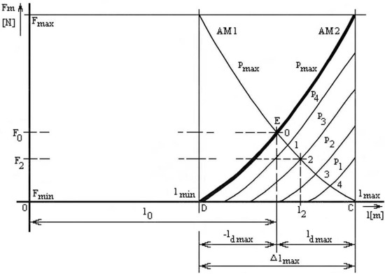In the case of this artificial muscle, the air pressure does not change, so only one of its properties is depicted, the one corresponding to the initial filling pressure pm. The property is drawn so that it describes antagonistic forces of AM1 against AM2. The AM1 muscle serves as a non-linear pneumatic spring. This ensures equality of forces for every position of the positive position value. It also provides stiffness of the actuator’s mechanism. Property intersection points in the EC section correspond to the course of increasing concentration of the passive AM of AM1 during a gradual pressure decrease in the active AM of AM2. The above-described procedure facilitates achieving an arbitrary positive value ld (up to ldmax). Actuator’s negative position values are reached through the same procedure as described in the previous paragraph. Only the roles of individual muscles are switched. AM1 has a variable air pressure; AM2 serves as a non-linear pneumatic spring.