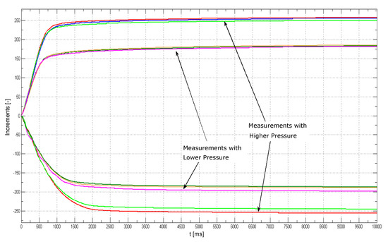 According to the new concept of actuator action prepared by the authors, if we change the pressure only in one muscle, we distinguish between active and passive AM. The active muscle is always the muscle with a variable air pressure. The passive muscle serves as a non-linear spring at constant air pressure, thus ensuring the stiffness of the actuator’s mechanism and equality of forces for every actuator position. When the air pressure changes (decreases), for example, in the AM2 muscle, the muscle contraction changes (decreases) as well (active muscle). As a result, the mass of the load on the arm attached to the pulley axis makes a rotary motion. Such motion direction is regarded as positive (+) with regard to the initial point. Negative position values (−) are achieved by the actuator in the same manner. Only the roles of the muscles are switched. The air pressure of AM1 is variable; AM2 serves as a non-linear pneumatic spring.