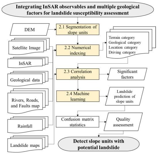 Slope instability is affected by the topography and geological conditions, and artificial construction, such as tree cutting for planting cash crops and building roads, increases the vulnerability of the landform. The prevailing extreme climate now promotes the possibility of landslide disasters in the event of short-term heavy rainfall. This study introduced the modern InSAR technology, terrain, geological, and rainfall observation data to construct spatial factors based on slope units. Through Spearman correlation analysis and verification, significant impact factors in the experimental areas were detected. More importantly, machine learning was applied for the first time to construct prediction models combining spatial factors and landslide issues. Finally, two field experiments confirmed the feasibility of the landslide susceptibility prediction analysis proposed in this study. The results prove that a better-than-80% model accuracy can be achieved by the Random Forest algorithm, and the InSAR observable is able to increase the accuracy of prediction for all training models. Relevant management will be able to follow the potential landslide slope unit to provide vegetation restoration and slope reinforcement. Eventually, this novel strategy will provide the benefits of prevention and rescue for slope landslide disasters in a forward-looking manner. Finally, it should be noted that this study only used the landslide cases in Taiwan as examples. Further studies can be conducted using the proposed methodology for the cases with various geological and climatic conditions around the world using the training data in that region.