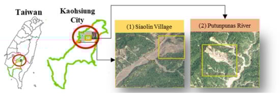 Experimental cases in Siaolin Village and the Putunpunas River area (Kaohsiung, Taiwan) were selected to verify this study method. Both areas continued to experience a large number of landslides after the typhoon Morakot in 2009. In the Siaolin Village area, there were 128 slope units (covering 15.81 km2), and Provincial Highway 29 is the main external traffic road. In the Putunpunas River area, there were 349 slope units (covering 61.21 km2), and the Southern Cross-Island Highway presents a north–south vertical, as shown in Figure 3.