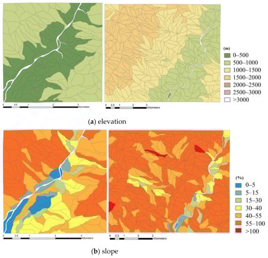 This study used the slope unit as the basis of analysis to show the topographic characteristics of each slope. These slope units serve as a framework for the subsequent geographical interpretation of environmental spatial factors. The method of slope unit segmentation refers to the catchment overlap concept proposed by Xie et al. [], as shown in Figure 2. First, the water catchment area in a DEM is identified through the hydrology module in the software ArcGIS, and the water line is turned into a ridge line by flipping the DEM, which is divided into two slope units (left and right). When the hydrology module identifies small catchment areas, the default flow accumulation value is set to 500 as the threshold value for dividing the river area. Then, the slope units are cut out, and each area becomes less than 30 ha. With the aid of a shadow map, aspect map, slope map, river map, and satellite orthophoto overlay, the overlap between each slope unit is confirmed.