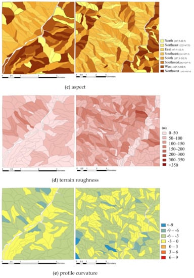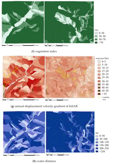 In this study, the spatial factors were divided into four categories: terrain, location, geological, and driving. The terrain category represents the geometric changes in surface elevation and coverage distribution, including elevation, slope, aspect, terrain roughness, profile curvature, vegetation index, and the displacement velocity gradient of InSAR. The location category shows the distance of influencing factors, including roads, rivers, and geo-faults. The geological category reflects the strength, folds, and dip slopes of rock formations. The driving category is the rainfall factor. The index calculations of these factors are described below. It should be mentioned that these spatial factors were first selected based on suggestions reported in the relevant studies in the literature [,,,,]. A significance test was then performed to identify the most influential factors that have the high correlation with the landslides in the study areas. The results and discussion on the significance test of spatial factors are presented in Section 3.2.