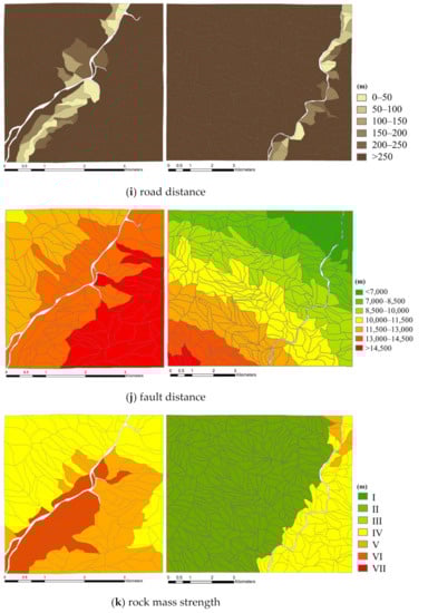The observation time of the spatial factors ranged from hours to years. For establishing a common timescale, a year was deemed the basis of unit time, and the observed data time was a total of four years (from 2007 to 2010). The 14 spatial factors used were the elevation, slope, aspect, terrain roughness, profile curvature, vegetation index, annual displacement velocity gradient of InSAR, water distance, road distance, fault distance, rock mass strength, folds, dip slopes, and an annual rainfall, as shown in Figure 4.