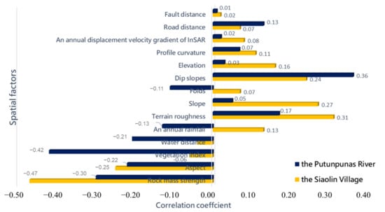 The factor scales were unified from 1 to −1 through numerical standardization to solve the inconsistency of the factor value distribution. Then, the correlation between the spatial factors and landslides based on the slope units was examined. The correlation coefficient values were expressed as positive or negative. As seen in Figure 5, the correlation coefficients of Siaolin Village (yellow bar) were between −0.47 and 0.43, and those of Putunpunas River (dark-blue bar) were between −0.42 and 0.36. Hypothesis significance testing was performed, and the probability of obtaining the test resulted in the p-value, as shown in Table 1. Then, the significant spatial factors were screened on the basis of a 99% reliability as the test threshold. There were five significant spatial factors in the Siaolin Village area (rock mass strength, aspect, terrain roughness, slope, and dip slopes) and six significant spatial factors in the Putunpunas River area (rock mass strength, aspect, vegetation index, water distance, terrain roughness, and dip slopes).