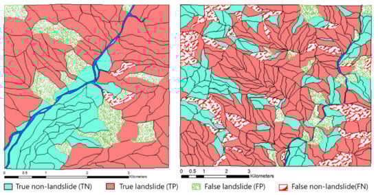 The prediction results of the best learning method (random forest) were used to compare and evaluate the predicted classification through confusion matrixes. In Figure 6, the correctly predicted landslide slope units are colored red, and the correctly predicted noncollapsed slope units are colored cyan. In addition, the erroneously predicted landslide slope units are marked with green diagonal stripes, and the erroneously predicted nonlandslide slope units are marked with red diagonal stripes.