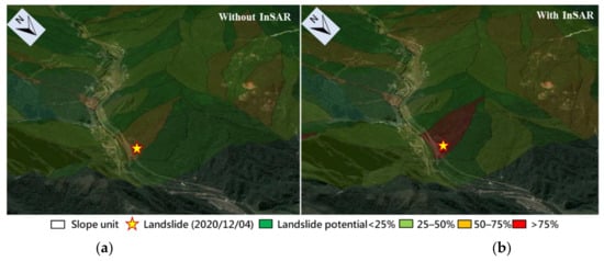 Landslide susceptibility analysis for the 2020 landslide case in northern Taiwan: (a) with InSAR data; (b) without InSAR data.